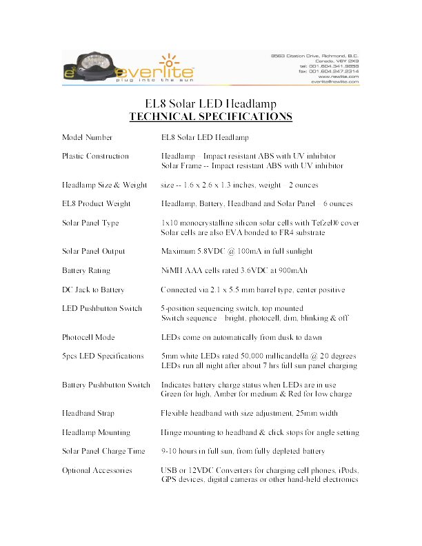 Home / Top of Page / EL8 Charging Uses / Jobsite Headlamp / Products / Charging iPod / EL8 Specifications Charging iPhone with Solar Energy / Charge iPod 80/160/GB with Solar Energy